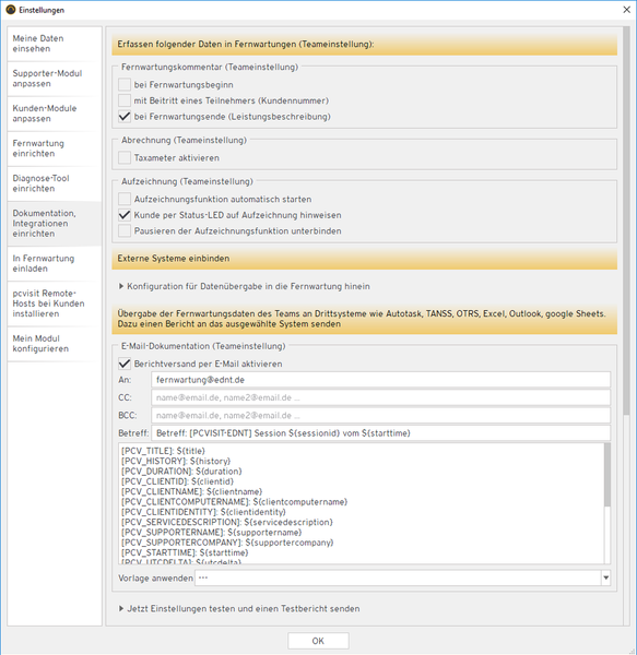 Um PCVISIT mit dem Ticketsystem zu verwenden muss in PCVISIT folgende Einstellungen durchgefführt werden: